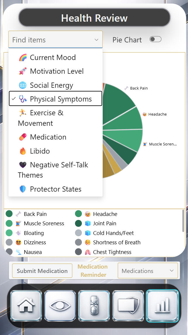 The Health Review screen is an exploratory analysis space that lets users examine patterns across different dimensions of their health data. It allows quick switching between categories—such as mood, symptoms, energy, or behavior—without leaving the context of the review.